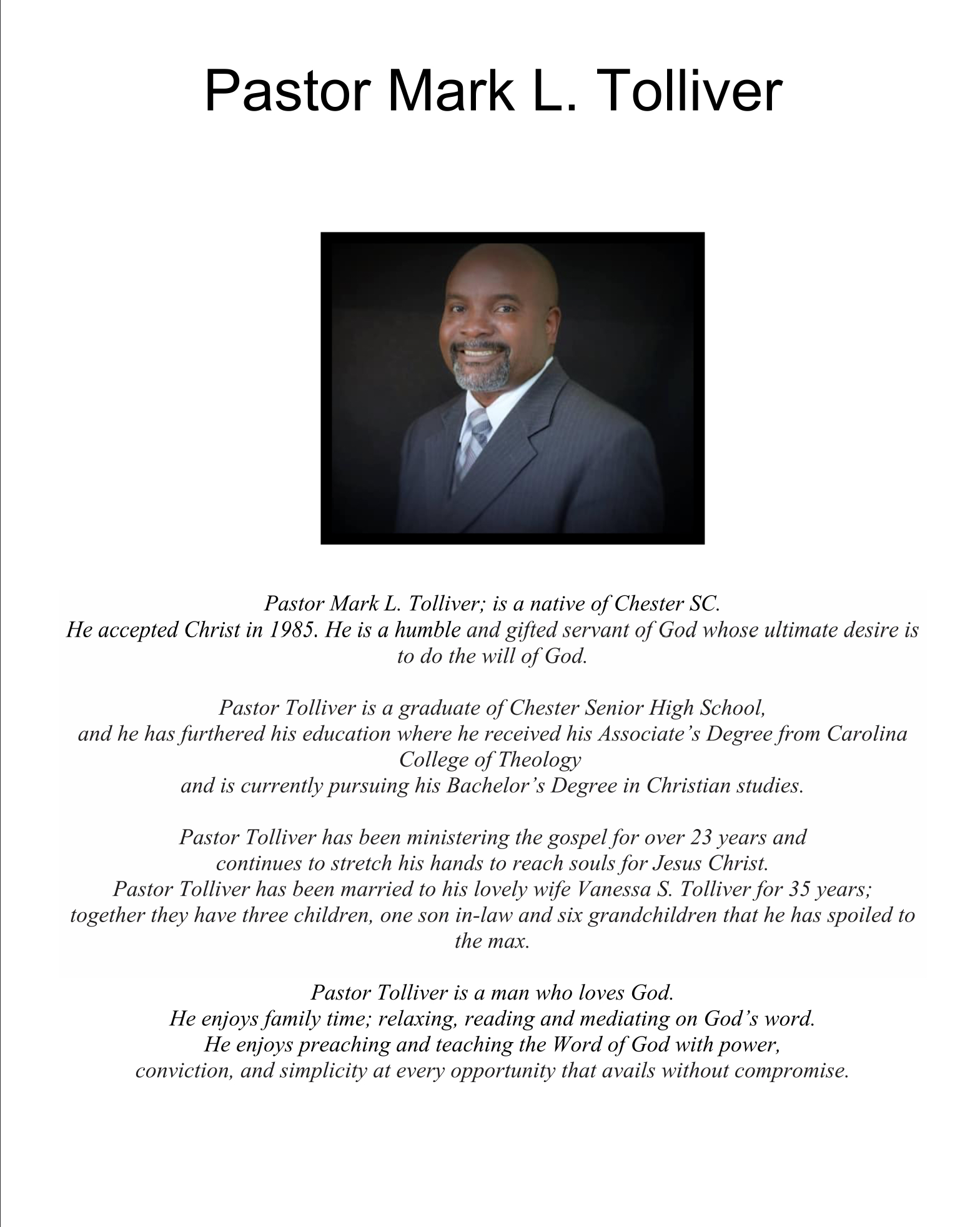 Pastor Mark L. Tolliver; is a native of Chester SC. He accepted Christ in 1985. He is a humble and gifted servant of God whose ultimate desire is to do the will of God.